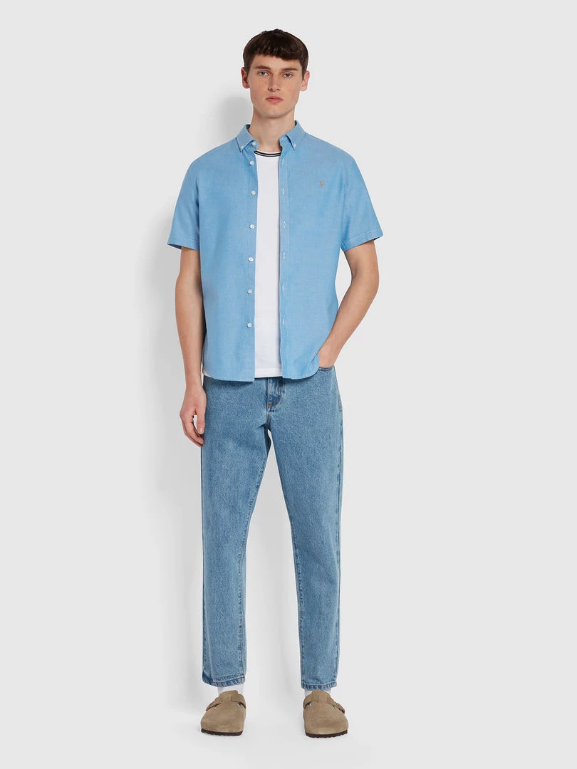 Farah Brewer Slim Fit Short Sleeve Organic Cotton Oxford Shirt In Mid Blue Shirts